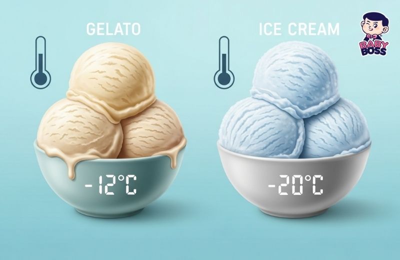 Kem Ý Gelato: Được phục vụ ở nhiệt độ ấm hơn (khoảng -12°C đến -14°C). Nhiệt độ lý tưởng này giúp giải phóng trọn vẹn hương vị mà không gây "sốc lạnh" cho lưỡi, cho phép bạn cảm nhận từng tầng hương tinh tế nhất.