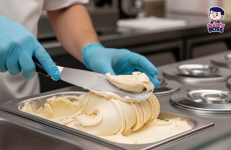 Dùng Spatula, không phải muỗng tròn: Các nghệ nhân gelato dùng một chiếc bay dẹt (spatula) để miết và phục vụ, thể hiện kết cấu dẻo của nó.