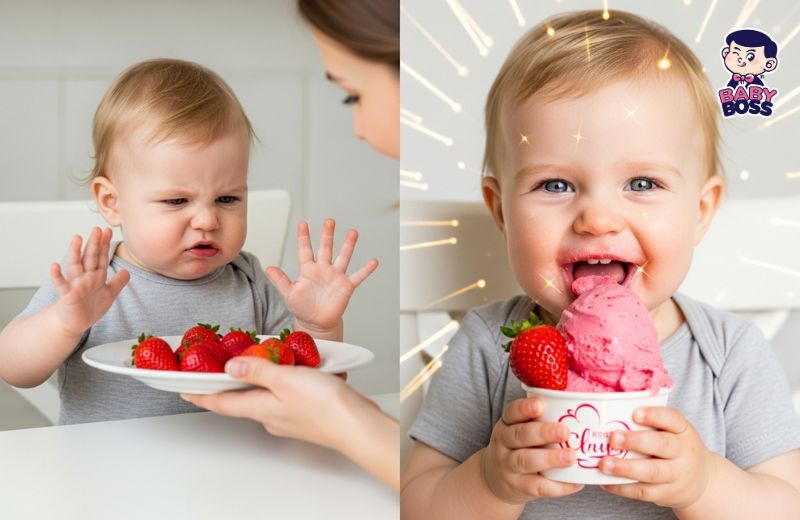 Đây là bước quan trọng. Lần tới, khi bé ăn kem Ý gelato dâu tây, hãy đặt một vài lát dâu tây tươi bên cạnh. Không ép bé ăn. Chỉ cần nói: "Đây là những quả dâu tây đã tạo nên vị kem ngon của con đấy. Con có muốn chạm vào thử không?". Hãy để bé tự do khám phá bằng các giác quan khác trước (nhìn, ngửi, chạm).
