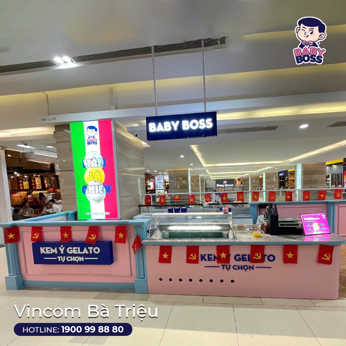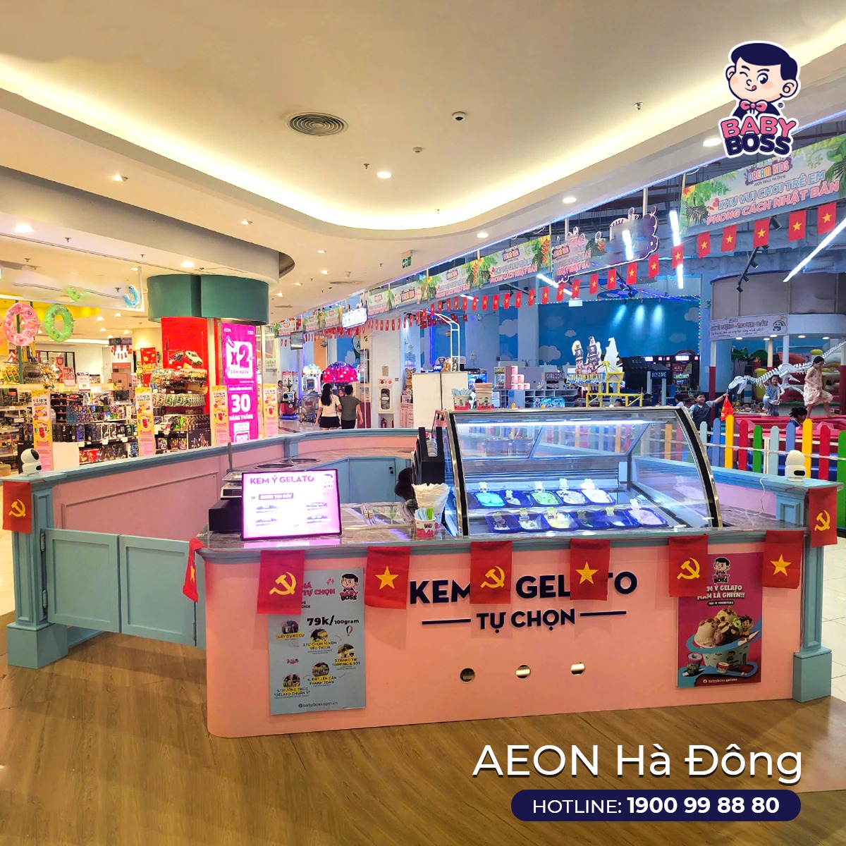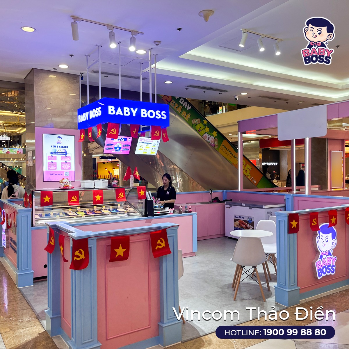 Baby Boss AEON Hà Đông & Go! Thăng Long: Ngay từ lối vào, bạn sẽ được chào đón bởi sắc đỏ rực rỡ. Những dải cờ nhỏ được treo trang trọng dọc theo quầy kính trưng bày kem Ý gelato, tạo nên một sự tương phản thú vị giữa màu sắc của những viên kem và màu cờ Tổ quốc. Đây là không gian lý tưởng cho các gia đình và các bạn trẻ vừa mua sắm, vui chơi, vừa có thể check-in trong không khí lễ hội.