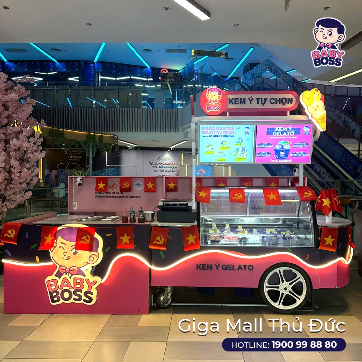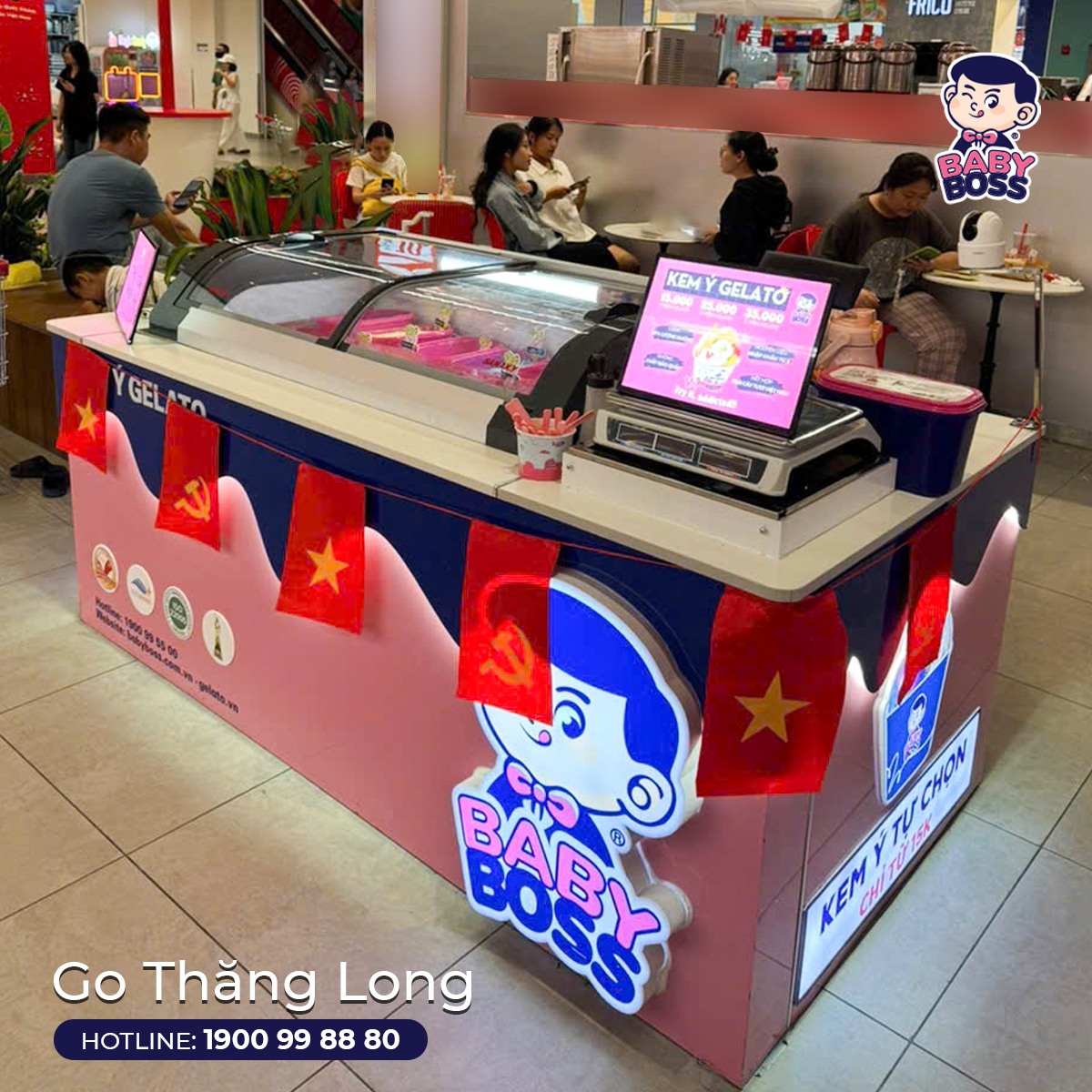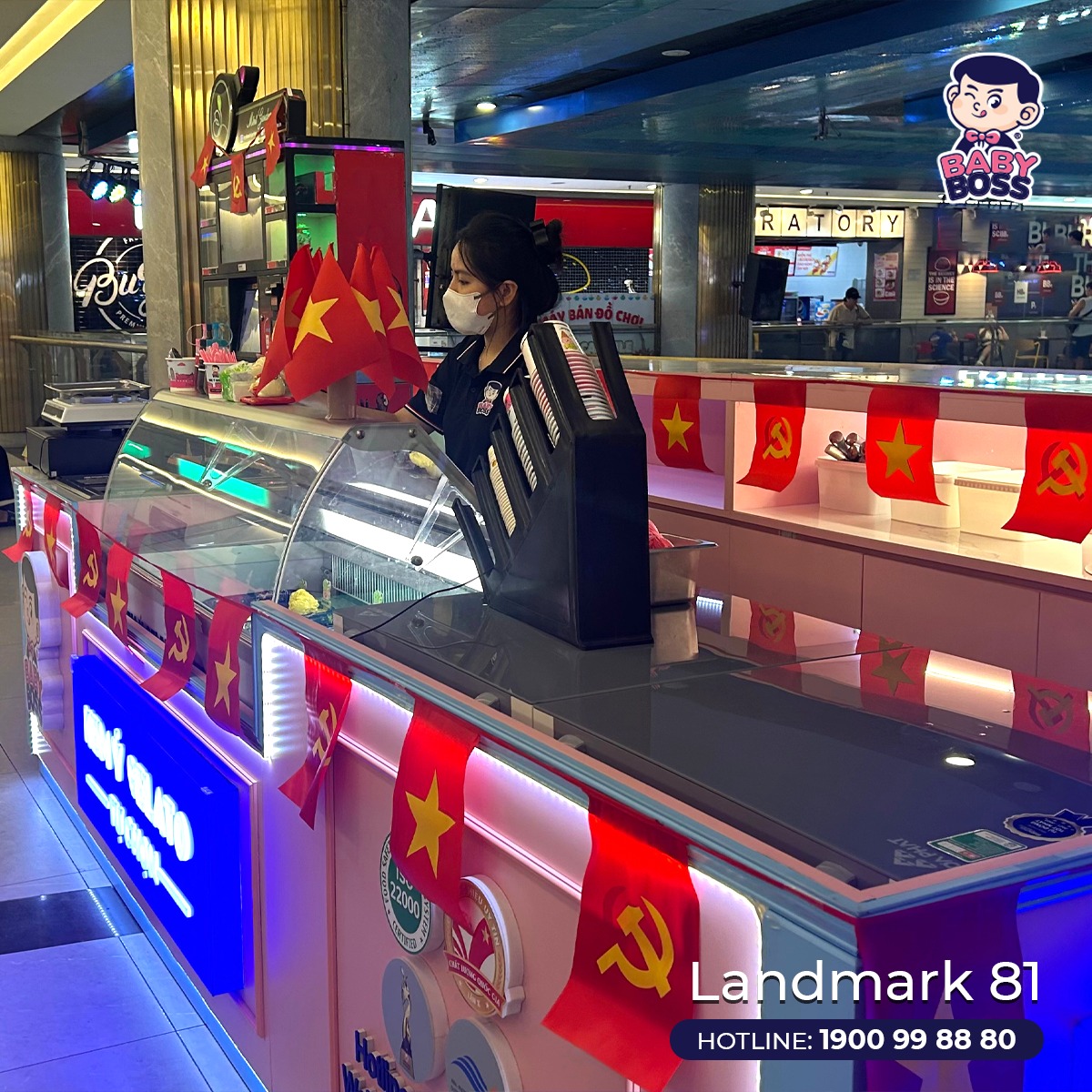 Baby Boss AEON Hà Đông & Go! Thăng Long: Ngay từ lối vào, bạn sẽ được chào đón bởi sắc đỏ rực rỡ. Những dải cờ nhỏ được treo trang trọng dọc theo quầy kính trưng bày kem Ý gelato, tạo nên một sự tương phản thú vị giữa màu sắc của những viên kem và màu cờ Tổ quốc. Đây là không gian lý tưởng cho các gia đình và các bạn trẻ vừa mua sắm, vui chơi, vừa có thể check-in trong không khí lễ hội.